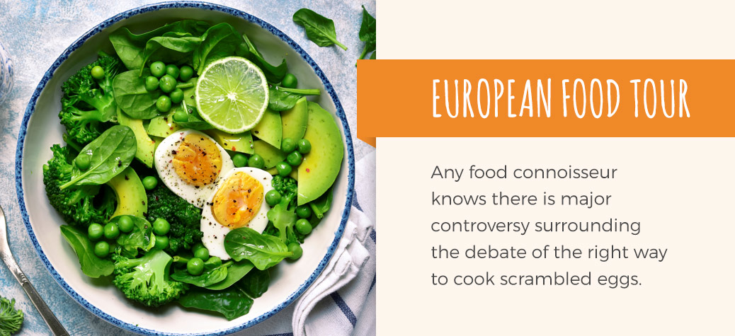 We begin our European food tour at the heart of luxury cuisine — France! Any food connoisseur knows there is major controversy surrounding the debate of the right way to cook scrambled eggs. Americans tend to use high heat, milk or water, and butter to create fluffy scrambled eggs in just a few minutes. The British alternate their eggs between high heat and no heat, while continuously stirring the egg mixture for a soft and loose scramble.