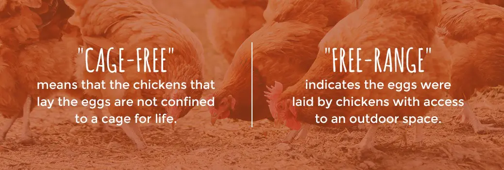 the difference between cage-free and free-range eggs The designation "cage-free" means that the chickens that lay the eggs are not confined to a cage for life. They are housed inside a single building. The difference from other farms is the chickens are allowed to move around a bit more. A label of "free-range" indicates the eggs were laid by chickens with access to an outdoor space. The quality of cage-free and free-range eggs depends on the farmers. Some brands that market free-range eggs do the bare minimum required to earn the label. Free-range chickens might still be crammed into a few square feet of cement when outside. Or they might have some wiggle room and access to fresh grass, worms, and bugs that improve their quality of life. These eggs usually cost about twice as much as conventional eggs.[2]