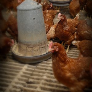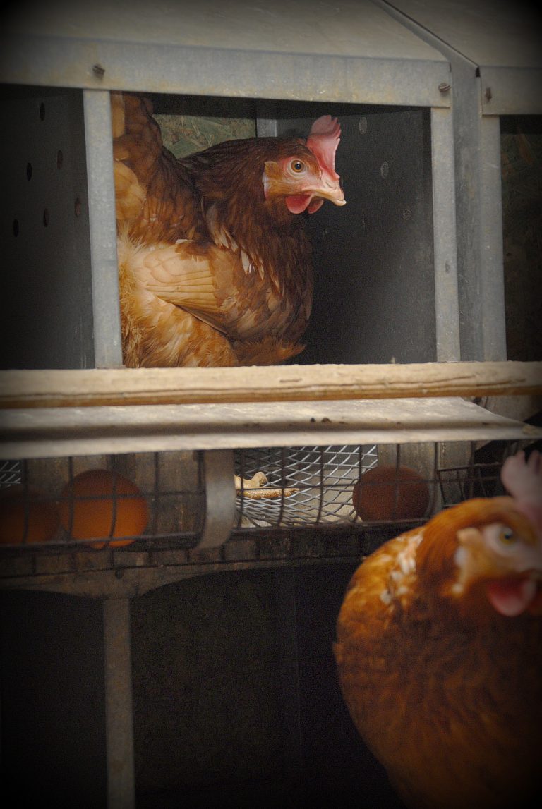 The chickens on the Stoltzfus farm are cage-free, meaning they are raised in a stress-free environment and are not in cages. They are kept in large heated and air-cooled growing houses where they can roost and socialize freely, participating in their chicken behaviors and pecking orders, and laying their eggs in dark, quiet nests.