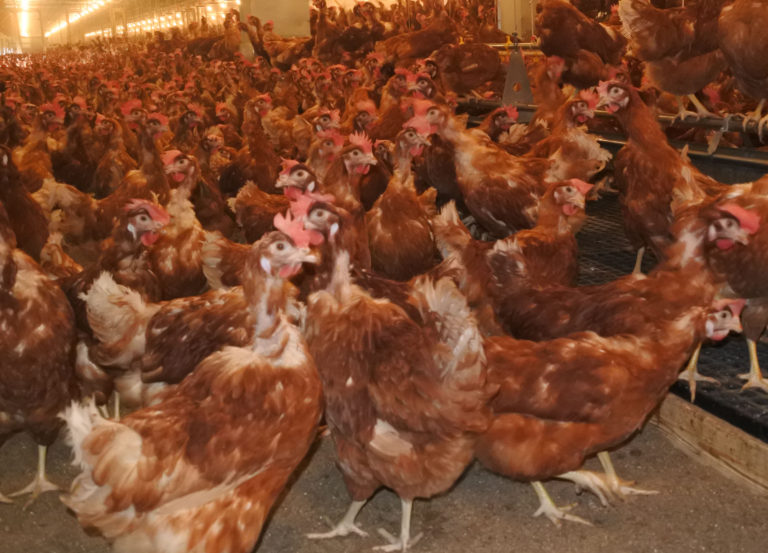This laying hen farm meets the standards for the Humane Farm Animal Care Program, which ensures that the hens on their farm are provided with a nutritious diet without antibiotics or hormones, and are raised with shelter, resting areas, sufficient space, and the ability to engage in natural behaviors.