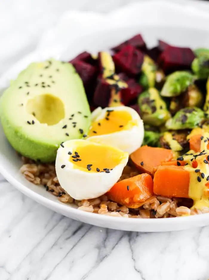 10. Top each quinoa bowl with half of an avocado and several jicama pieces. Add half of the sweet potato and egg mixture to each bowl. Top with tahini sauce and toasted sesame seeds.